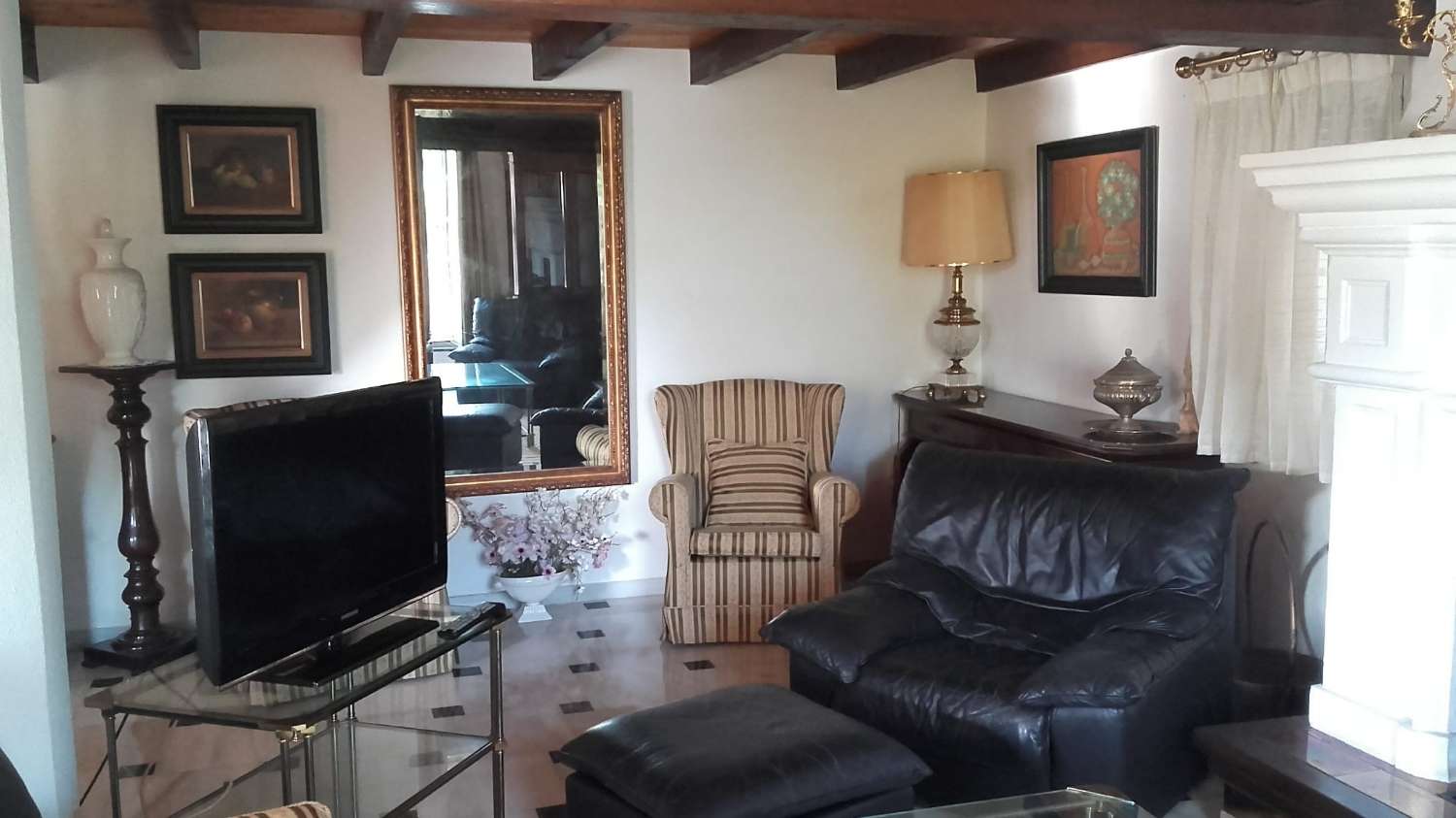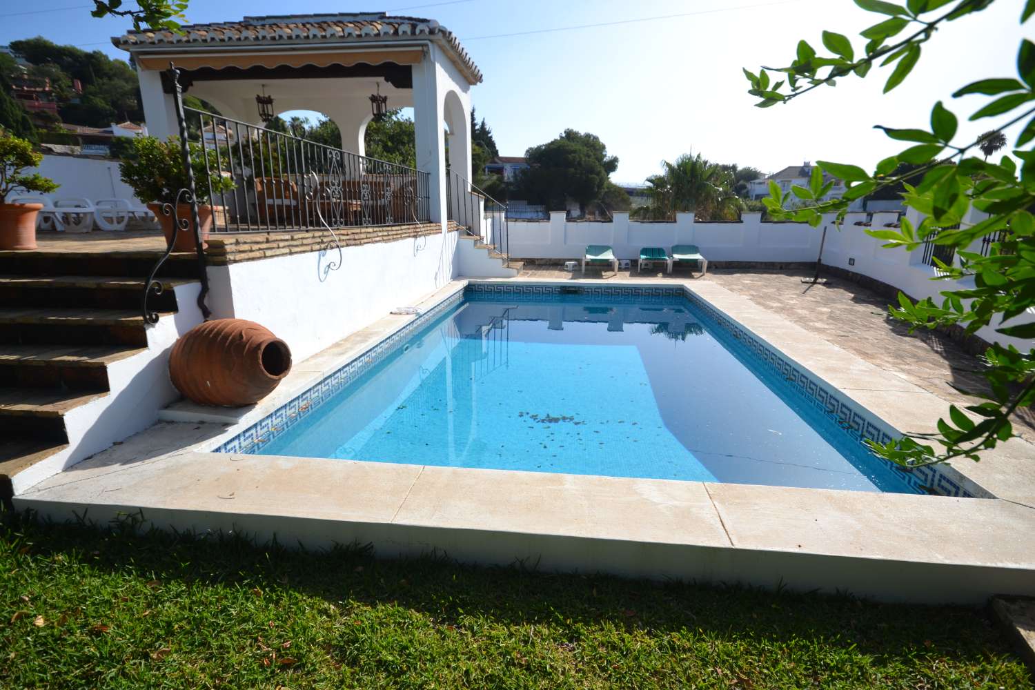 Fantastic Villa for sale in Benalmadena. The area is characterised by its tranquillity and views of the sea and the bay of Fuengirola. The main house has 4 bedrooms, 3 bathrooms, 1 toilet, large living room with fireplace, library, separate kitchen with pantry. Several terraces. 1 guest apartment with bedroom, living room with kitchenette and bathroom. It has a laundry area, gardening tool room, closed garage for 2 cars. In the garden there are mature trees such as palm trees, ficus and 1 centenary carob tree, a hedge of cypresses to the west and tall specimens to the east that give an air of privacy to the garden, pool and barbecue areas.